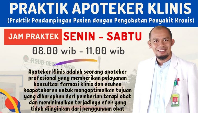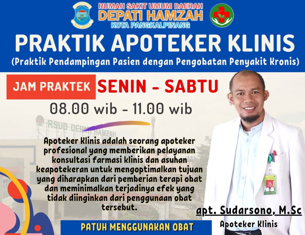 Apoteker klinis di RSUD Depati Hamzah Kota Pangkalpinang memberikan pelayanan langsung dalam rangka meningkatkan outcome terapi dan meminimalkan resiko terjadinya efek samping karena obat, untuk tujuan keselamatan pasien (patient safety) sehingga kualitas hidup pasien terjamin.