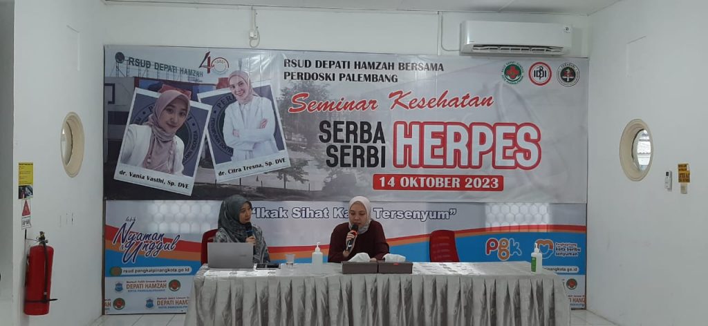 14 Oktober 2023 – RSUD Depati Hamzah bersama Perdoski (Persatuan Dokter Spesialis Kulit dan Kelamin Indonesia), menyelenggarakan seminar kesehatan dalam rangka memperingati world herpes awareness day. Kegiatan yang mengangkat tema “Serba Serbi Herpes” ini berlangsung secara offline di Ruang Betason RSUD Depati Hamzah dan onlive via zoom meeting serta live streaming di Youtube RSUD Depati Hamzah serta diikuti oleh umum dan tenaga kesehatan.