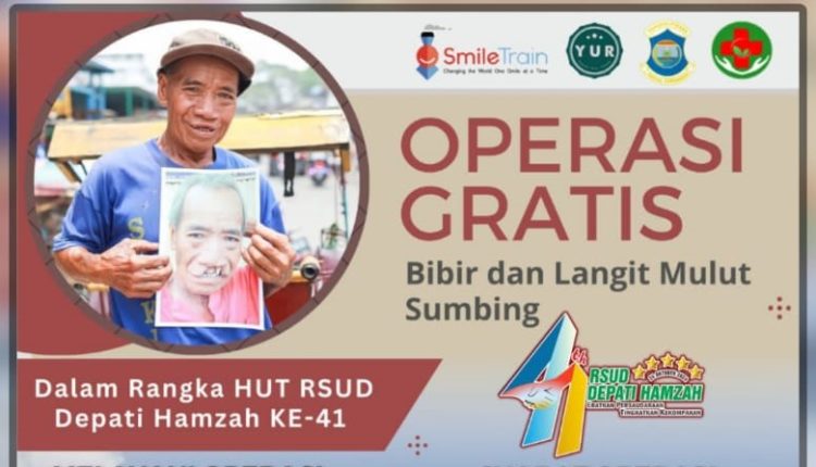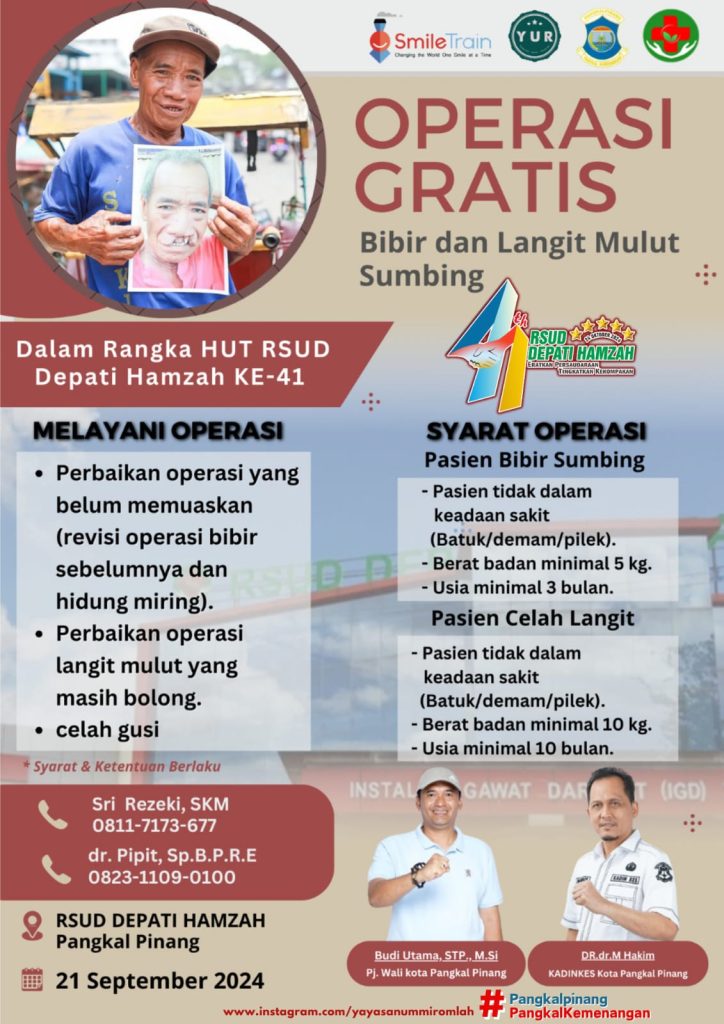 RSUD Depati Hamzah Kota Pangkalpinang kembali melaksanakan Bakti Sosial kepada masyarakat dalam rangka HUT RSUD Depati Hamzah Kota Pangkalpinang ke- 41 tahun yang salah satu rangkaian kegiatannya adalah melaksanakan Operasi Gratis Bibir dan Langit Sumbing. Kegiatan Operasi Gratis Bibir Sumbing ini sudah beberapa kali dilaksanakan oleh RSUD Depati Hamzah Kota Pangkalpinang. Untuk tahun ini, kegiatannya insyaallah akan dilaksanakan pada hari Sabtu, 21 September 2024 di RSUD Depati Hamzah Kota Pangkalpinang.
