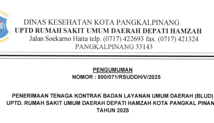 PENGUMUMAN PENERIMAAN TENAGA KONTRAK BADAN LAYANAN UMUM DAERAH (BLUD) RSUD DEPATI HAMZAH KOTA PANGKALPINANG TAHUN 2025 Pengumuman By admin On May 16, 2025 0 Share UNDUH PENGUMUMAN PENERIMAAN BROSUR PENGUMUMAN PENERIMAAN TENAGA KONTRAK BADAN LAYANAN UMUM DAERAH (BLUD) RSUD DEPATI HAMZAH KOTA PANGKALPINANG TAHUN 2025 0 Share